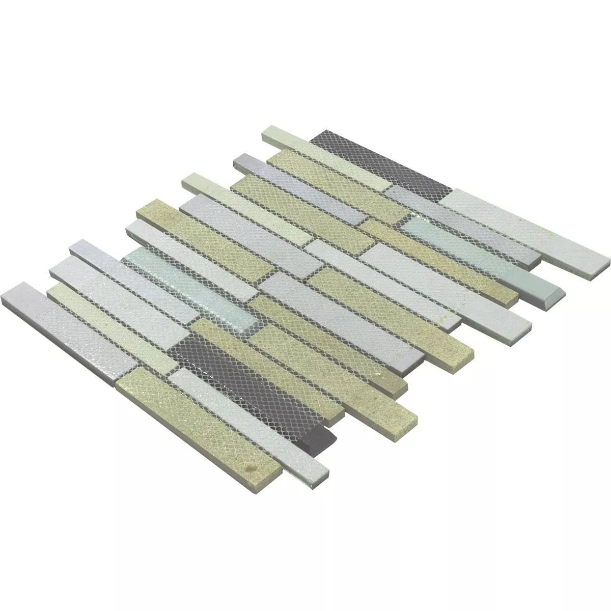 Die Mischung aus Keramik, Naturstein und Glas verleiht diesen Fliesen eine faszinierende Struktur und ein glänzendes Finish. Die unterschiedlichen Steingrößen von 15x148mm und 23x148mm verleihen der Fläche eine lebendige und moderne Optik.