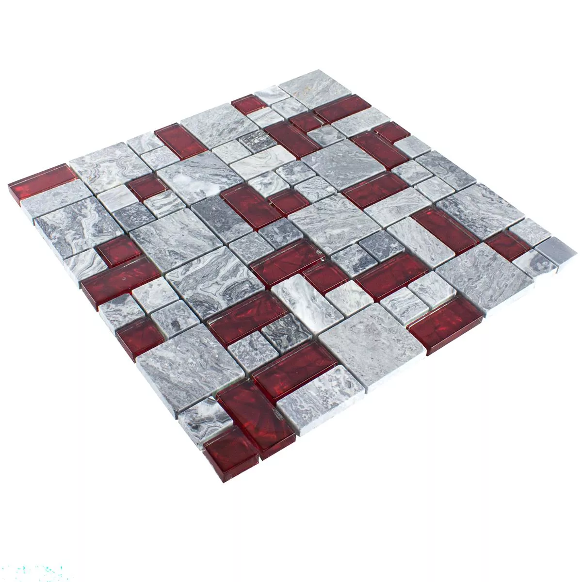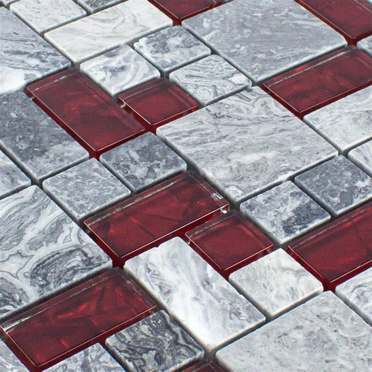 Mit einer glänzenden, polierten Oberfläche bietet die Fliese ein edles Finish, das durch die Farbnuancen in Rot und Grau besonders hervorgehoben wird. Die Steingrößen variieren zwischen 48 x 48 mm und 23 x 23 mm, was in Kombination mit dem Format im Quadrat und Rechteck ein abwechslungsreiches und strukturiertes Design ermöglicht. Jede Fliese hat eine Stärke von 8 mm und ist in Matten von 30 x 30 cm Größe erhältlich, was eine Fläche von 0,090 m² abdeckt.