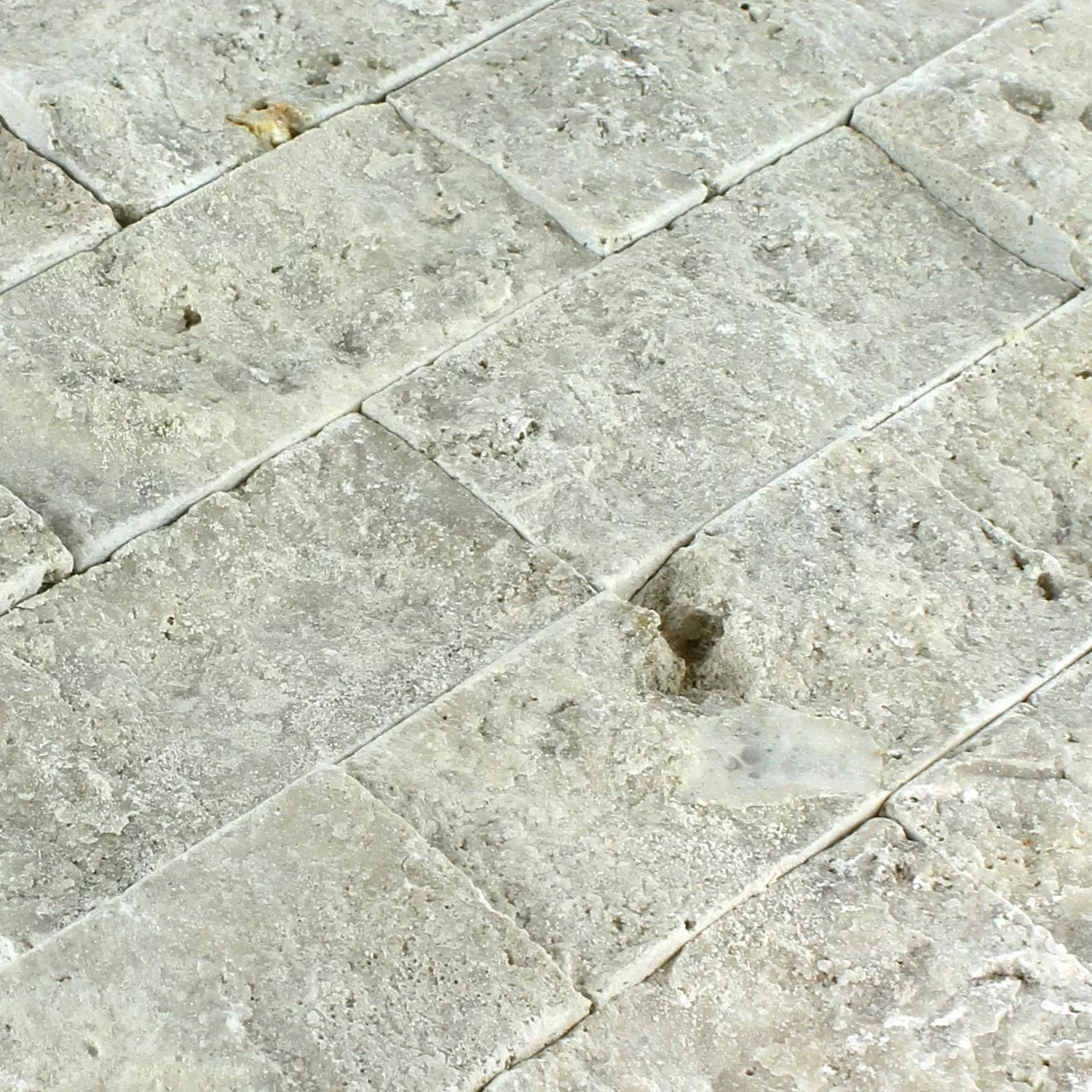 Mosaikfliesen liegen im Trend, denn sie zaubern mit ihren vielen Natursteinfliesen ein behagliches Ambiente in jeden Raum. Das Modell Sumba Silber Brick ist aus hochwertigem Travertin in der aktuellen 3D Optik gestaltet. Daher sehen alle Wände, die mit diesen robusten Mosaikfliesen belegt werden, auch optisch ansprechend aus. Die hellen beigefarbenen Mosaikfliesen Sumba Brick mit den dunklen Sprenkeln sind mit einer matt getrommelten Oberfläche gearbeitet. Diese Oberfläche betont das natürliche Material dieser Fliesen.