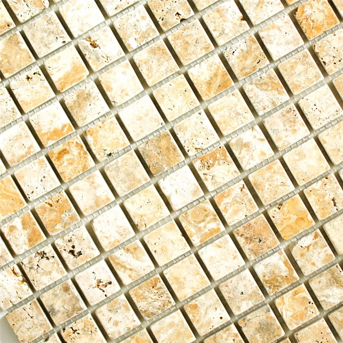 Die Mosaikfliesen Travertin Castello Gold 23 sind ein Naturprodukt. Travertin, der Stein aus Tivoli hat einen besonders maritimen Charme und seine porös wirkende Oberfläche macht dieses Naturprodukt so anziehend. Diese Fliesen mit der Bezeichnung Travertin Gold haben auch einen gewissen goldenen Schimmer in der schönen Farbgebung. Es handelt sich um Naturfliesen, die auch mit Natürlichkeit und ihrer belebten Oberfläche wirken.