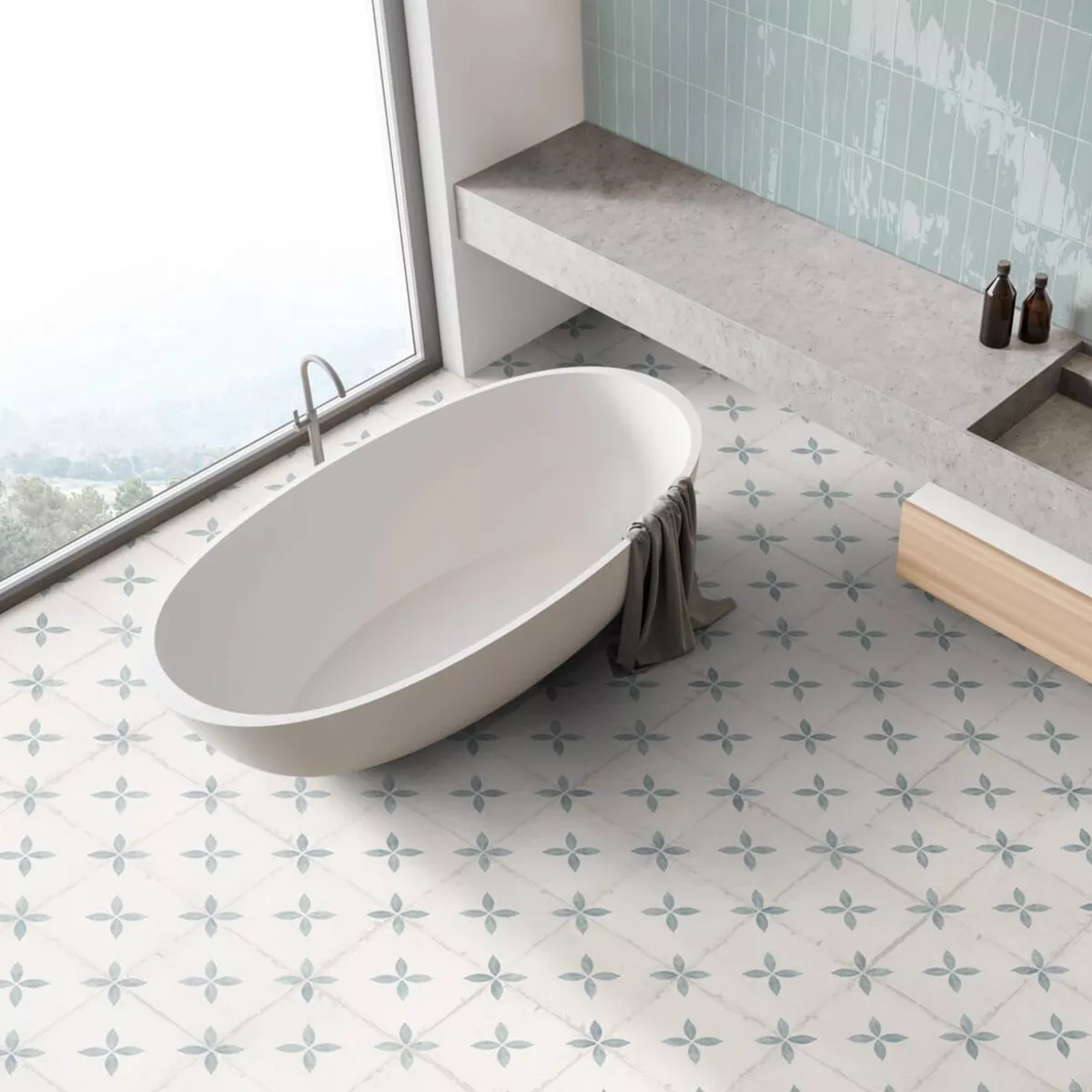 Diese hochwertige Feinsteinzeug Bodenfliese aus der renommierten Pelin Fliesenkollektion zeichnet sich durch ihre vielfältige Einsatzmöglichkeit aus und erlaubt Ihnen, viele Räume Ihres Hauses gleichzeitig aufzuwerten. Ob in der Küche, im Badezimmer, im Wintergarten, im Flur oder im Wohnzimmer - die hellblaue und cremefarbene Bodenfliese macht in jedem Raum eine gute Figur.