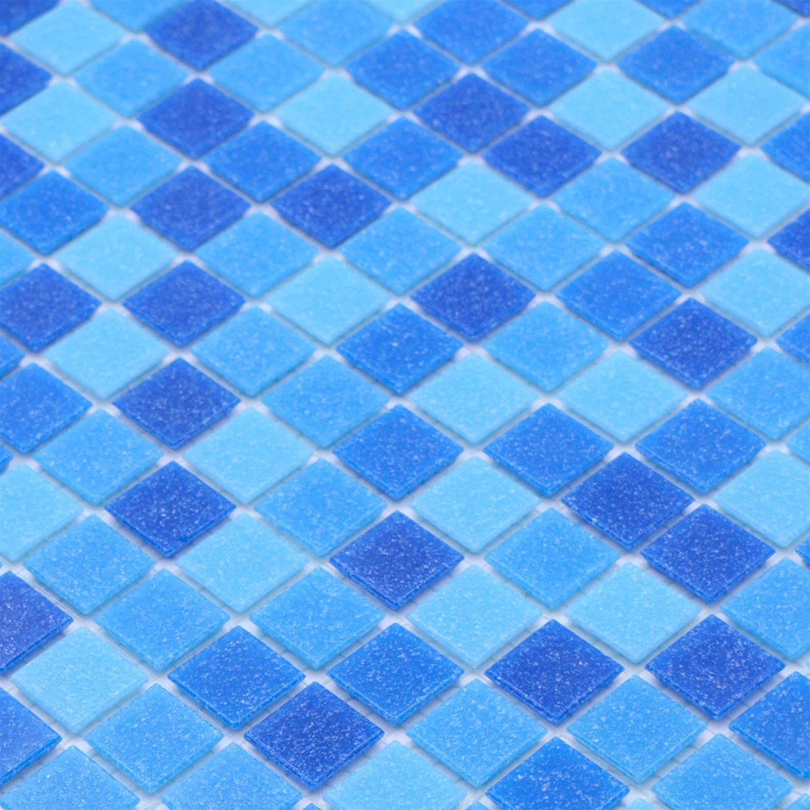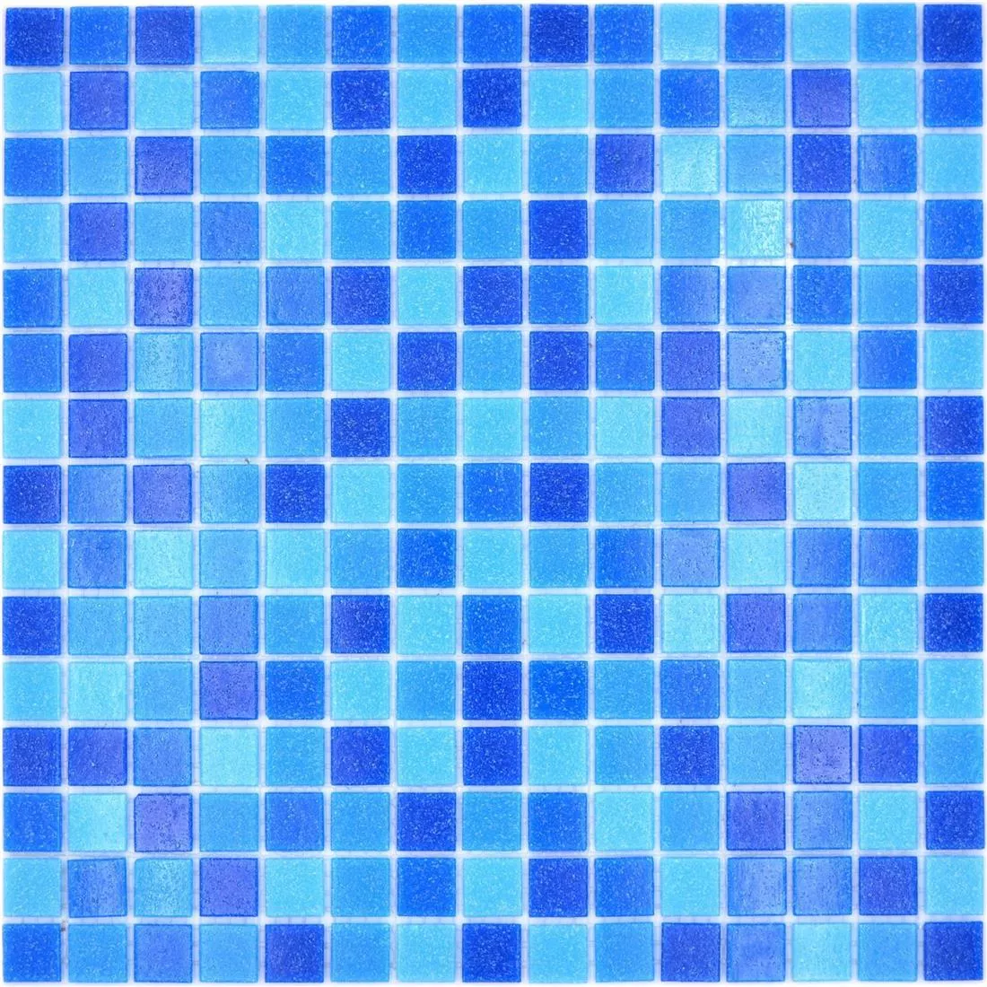 Unsere Fliesen für Ihr Schwimmbad: Der intensive Blau - Hellblau Mix wird den Pool in ein ansprechendes Nass verwandeln, denn das Wasser erhält eine wunderbare klare Farbe. Von weitem erscheint es als hätten Sie sich die Nord See nach Hause geholt. Es sind Mosaikfliesen, die auf einzelnen Matten papierverklebt sind, damit die Verlegung schnell von der Hand geht. Dazu bedarf es nicht nur eine Profihand. Die quadratischen Matten lassen sich einfach in den Pool verlegen. Mit einem Messer kann das Gewebe geschnitten werden und der benötigten Größe angepasst werden.