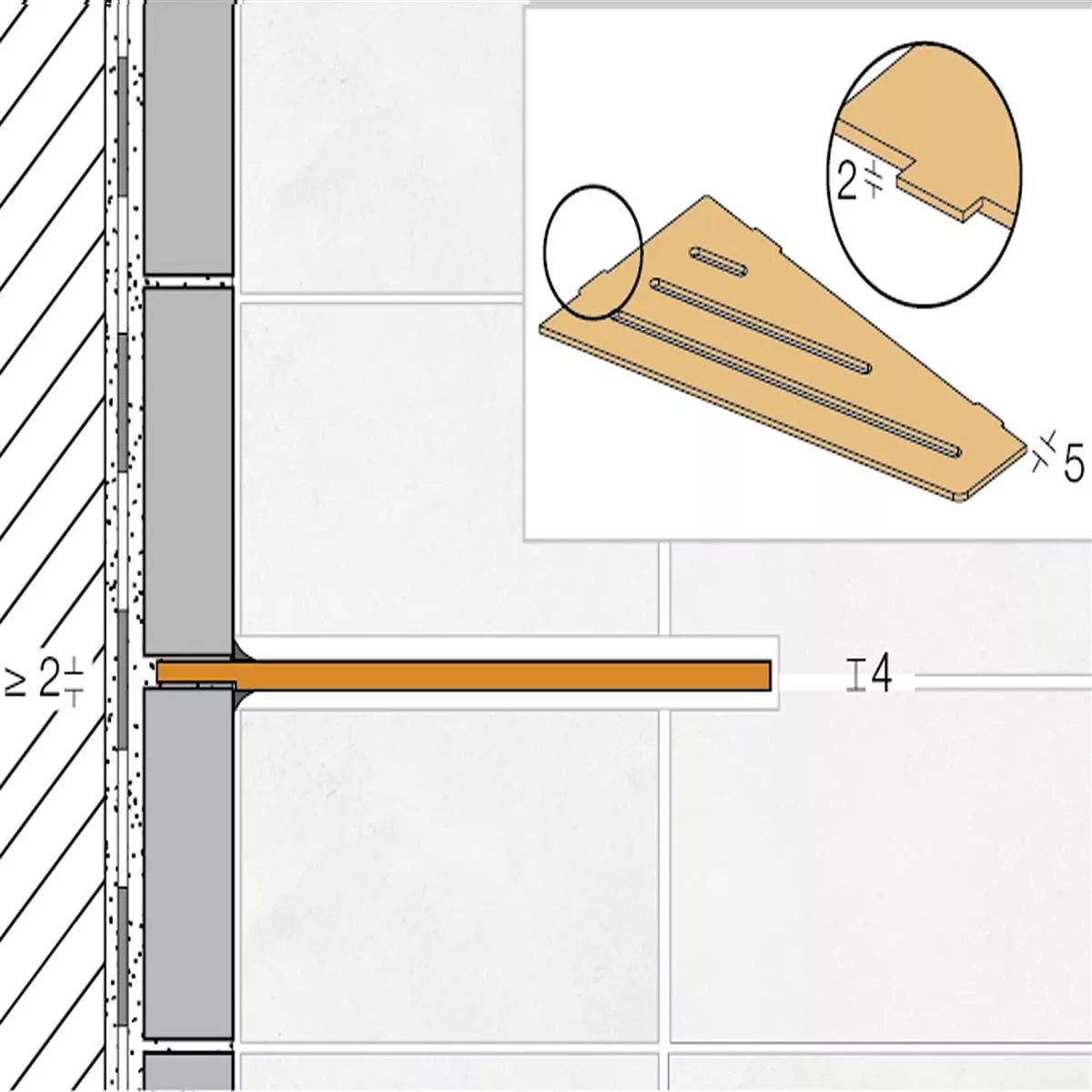 2. Nach der Trocknung des Fliesenklebers ist die Ablage SHELF-E zu positionieren und von den Außenecken der Ablage ca. 1 cm nach innen auf der Fliese zu kennzeichnen. Zum Schutz vor Verschmutzung sollte während der anschließenden Verfugung die Ablage entfernt werden. Im Bereich der Kennzeichnungen ist die Fuge frei zu lassen.