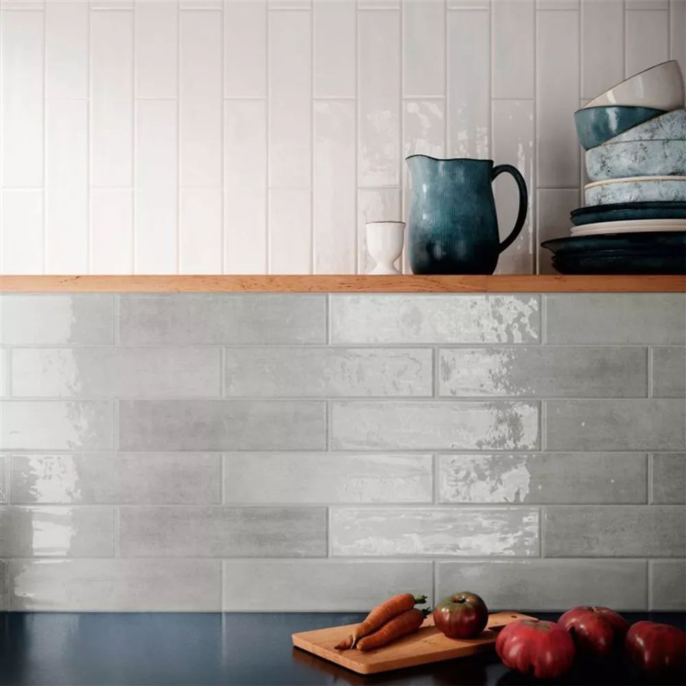 Diese glasierten rechteckigen Fliesen mit den Maßen 7,5x30cm und einer Stärke von 8,4mm bringen eine Vintage-Ästhetik in Ihre Räume. Die gewellte, glänzende Oberfläche verleiht Ihren Wänden eine subtile Dynamik.