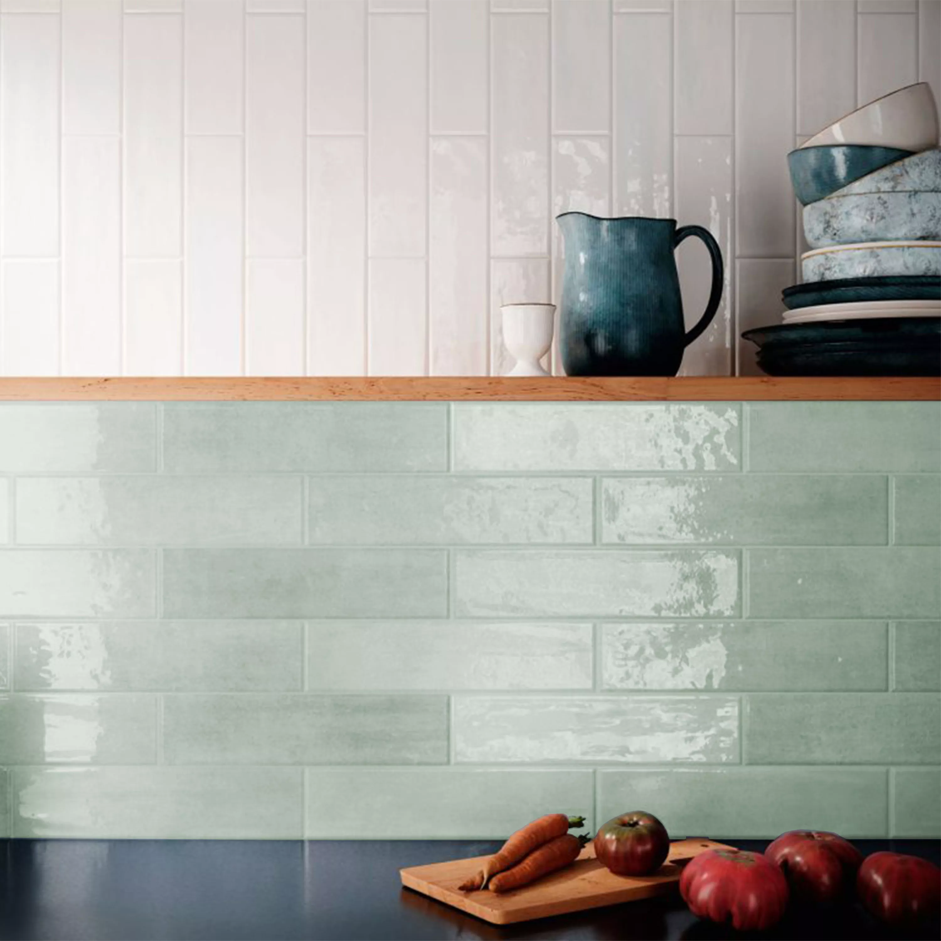 Verleihen Sie Ihren Wänden mit unseren Wandfliesen Tropea in glänzendem Grün und gewellter Struktur einen frischen Hauch von Natur. Diese glasierten rechteckigen Fliesen mit den Maßen 7,5x30cm und einer Stärke von 8,4mm bringen eine Vintage-Ästhetik in Ihr Zuhause. Die gewellte, glänzende Oberfläche verleiht Ihren Räumen eine subtile Dynamik und erzeugt ein lebendiges Ambiente.